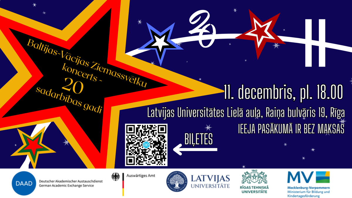 Baltijas-Vācijas Augstskolas birojs organizē koncertu „Baltijas-Vācijas Ziemassvētku koncerts - 20 sadarbības gadi” š. g. 11. decembrī plkst. 18.00 Latvijas Universitātes Lielajā aulā, Raiņa bulvārī 19, Rīgā. Ierašanās no plkst. 17.30.
