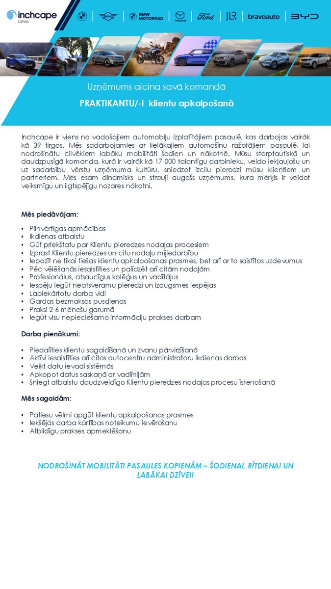 Inchcape ir viens no vadošajiem automobiļu izplatītājiem pasaulē, kas darbojas vairāk kā 40 tirgos. Mēs sadarbojamies ar lielākajiem automašīnu ražotājiem pasaulē, lai nodrošinātu cilvēkiem labāku mobilitāti šodien un nākotnē.