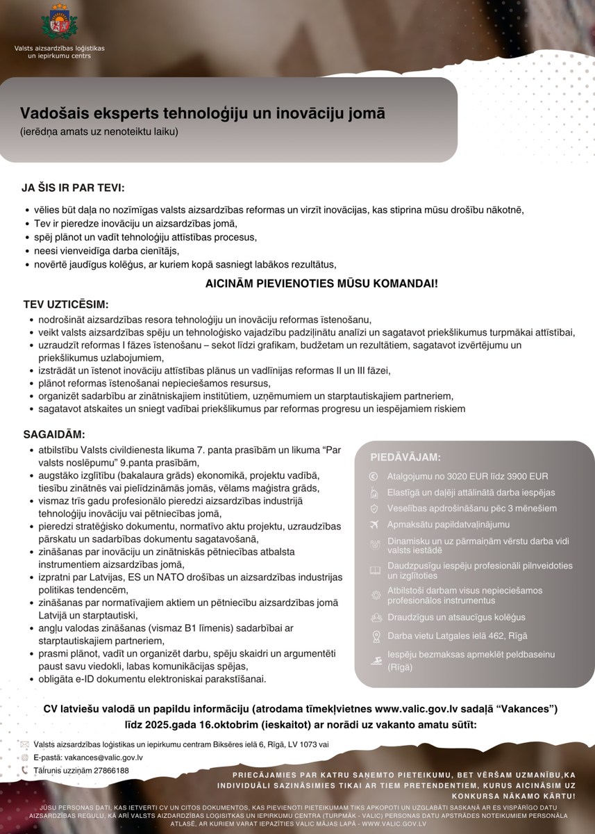 Valsts aizsardzības loģistikas un iepirkumu centrs aicina pievienoties komandai vadošo ekspertu tehnoloģiju un inovāciju jomā, kurš vēlas virzīt aizsardzības nozares reformas un attīstīt inovācijas, kas stiprina Latvijas drošību. Amata pienākumos ietilpst tehnoloģiju un inovāciju attīstības plānošana, sadarbība ar zinātniskajām institūcijām un starptautiskajiem partneriem, kā arī reformu īstenošanas uzraudzība. Piedāvājam atalgojumu no 3020 līdz 3900 EUR, elastīgu darba modeli, veselības apdrošināšanu un profesionālās izaugsmes iespējas.