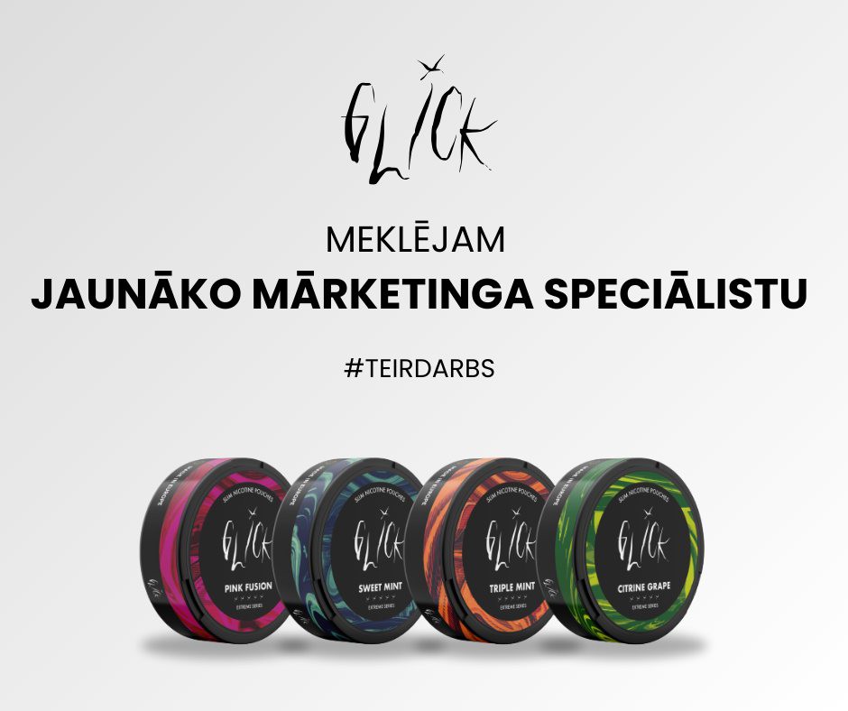Glick mēs ražojam un izplatām augstas kvalitātes nikotīna maisiņus tirgos visā pasaulē. Mēs esam komanda, kuru virza radošums, precizitāte un attīstība un šobrīd meklējam Junior mārketinga speciālistu/-i, kurš/-a ir ambiciozs/-a, radošs/-a un gatavs/-a augt kopā ar mums.