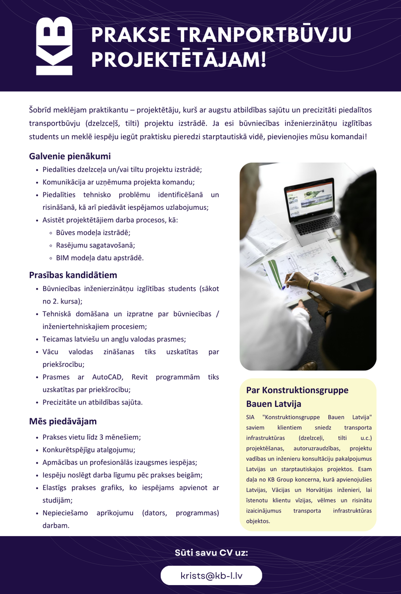 SIA "Konstruktionsgruppe Bauen Latvija" saviem klientiem sniedz transporta infrastruktūras (dzelzceļi, tilti u.c.) projektēšanas, autoruzraudzības, projektu vadības un inženieru konsultāciju pakalpojumus Latvijas un starptautiskajos projektos. Esam daļa no KB Group koncerna, kurā apvienojušies Latvijas, Vācijas un Horvātijas inženieri, lai īstenotu klientu vīzijas, vēlmes un risinātu izaicinājumus transporta infrastruktūras objektos.