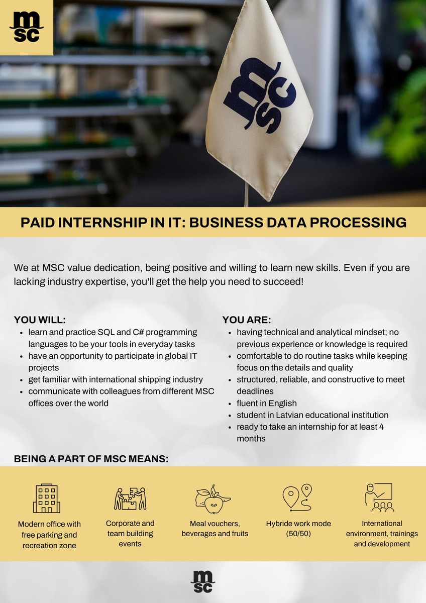 Our MSC Shared Service Center Riga Ltd. provides professional remote business support to many of our offices worldwide. Working for us will give you the opportunity to work directly with international trade in various positions, in an industry that is constantly evolving.Address: Uriekstes Street 2A, Riga LV-1005, Latvia