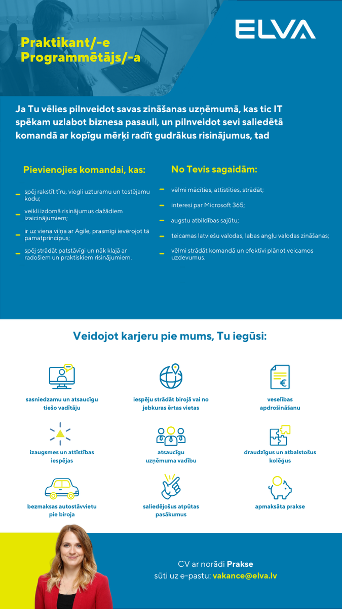 Jau vairāk nekā 20 gadus ELVA palīdz uzņēmumiem Baltijā un ārpus tās izmantot tehnoloģiju sniegtās iespējas, lai sasniegtu biznesa mērķus un stiprinātu konkurētspēju. Kā uzticams Microsoft partneris mēs ieviešam un attīstām ERP risinājumus biznesa procesu efektīvākai vadībai, BI risinājumus datu analītikai un gudrākiem lēmumiem, HR risinājumus personāla procesu pārvaldībai un CRM risinājumus klientu attiecību stiprināšanai.