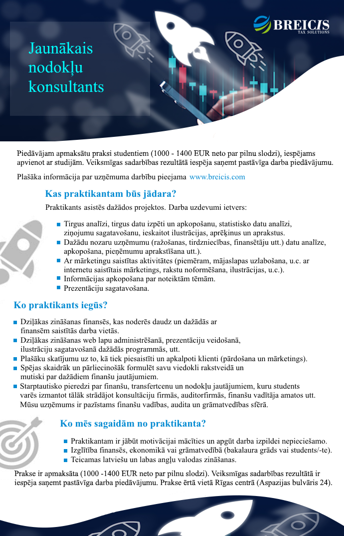 Praktikants piedalīsies nodokļu un finanšu projektos. Darba uzdevumi ietvers: