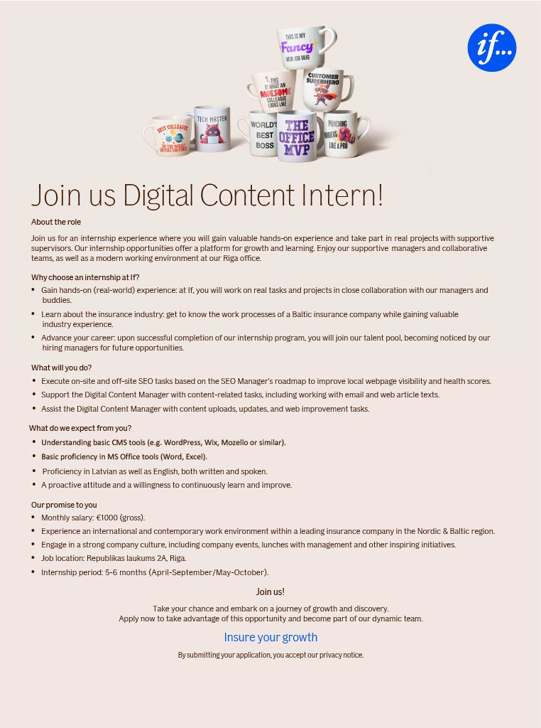 If pieder lielākajai nedzīvības apdrošināšanas kompānijai Ziemeļeiropā - If P&C Insurance Holding Ltd, kuras īpašnieks ir Sampo Group. Piedāvājam pilnu riska apdrošināšanas pakalpojumu klāstu gan privātpersonām, gan uzņēmumiem Zviedrijā, Norvēģijā, Somijā, Dānijā un Baltijas valstīs. Mūsu Baltijas IT nodaļa veido ~35% no mūsu IT speciālistiem, kas palīdz nodrošināt augstākās klases risinājumus mūsu Skandināvijas un Baltijas klientiem un stabilu darba vidi visiem If darbiniekiem.